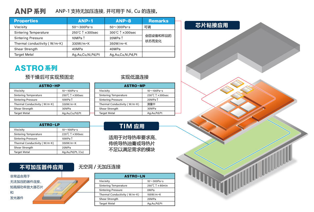 随着 ASTRO系列 的加入,以及由纳米级(0.000001mm)银粒子经醇类衍生物包覆而成的烧结型连接材料 Alconano银膏,我们的产品阵容得到了进一步扩充。
